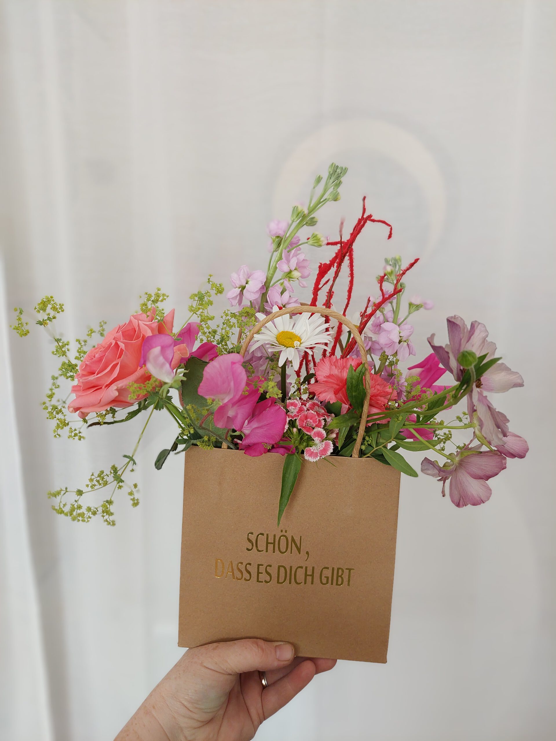 Gestalte in einer ausgelassenen Atmosphäre, unter professioneller Anleitung eine Flowertasche aus besonderen Frischblumen.